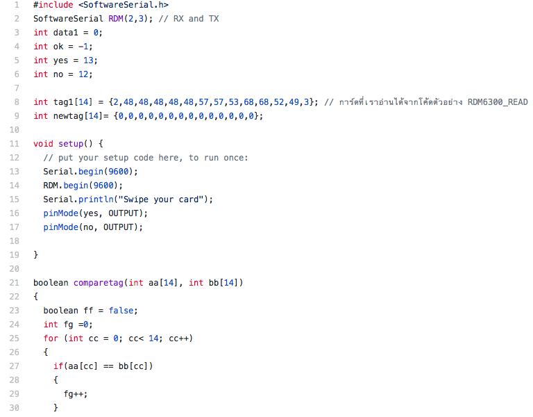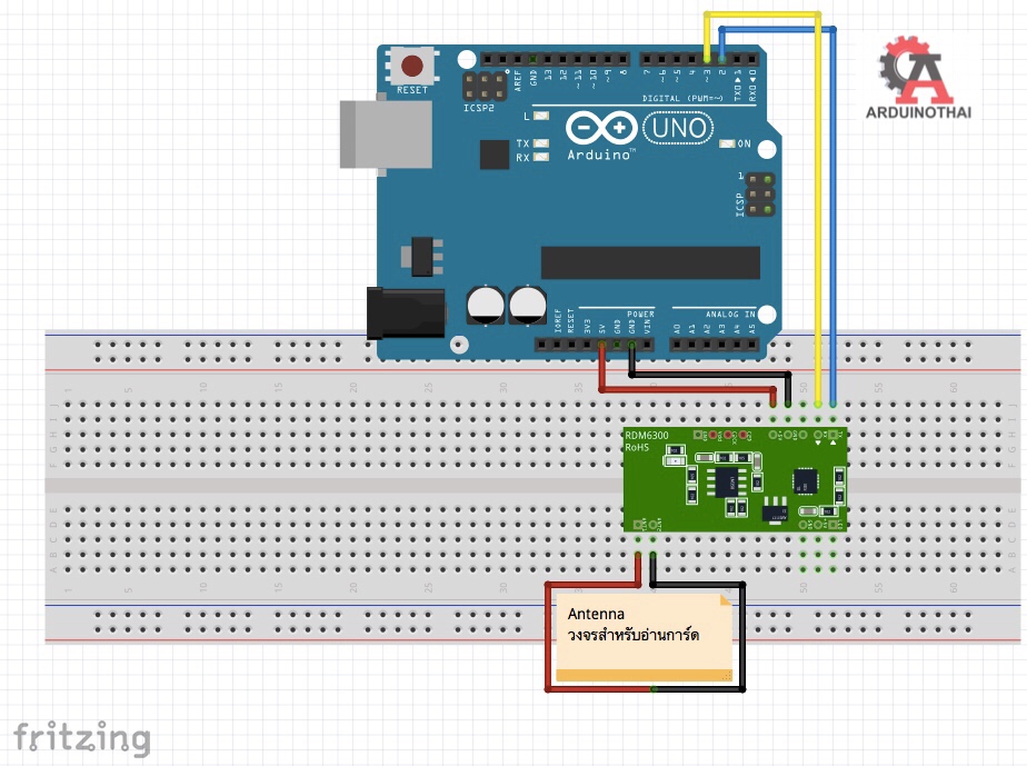 RFID Reader Module (RDM6300 125kHz) เป็นโมดูลสำหรับอ่าน คีย์การ์ด(Mifare) ที่ความถี่ 125Mhz ใช้ไฟเลี้ยง 5VDC การสื่อสารเป็นแบบ Serial (TxRx)